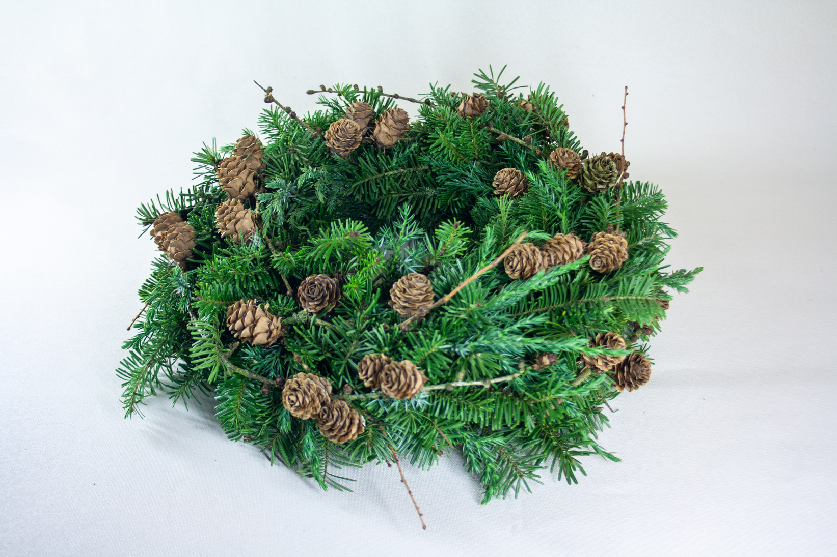 Baltegles vainags ar kadiķa zariem, diametrs 22 cm, izgatavots uz pašu izgatavotas salmu pamatnes. Dekorēts ar dabīgiem hibrīdās lapegles čiekuriem.