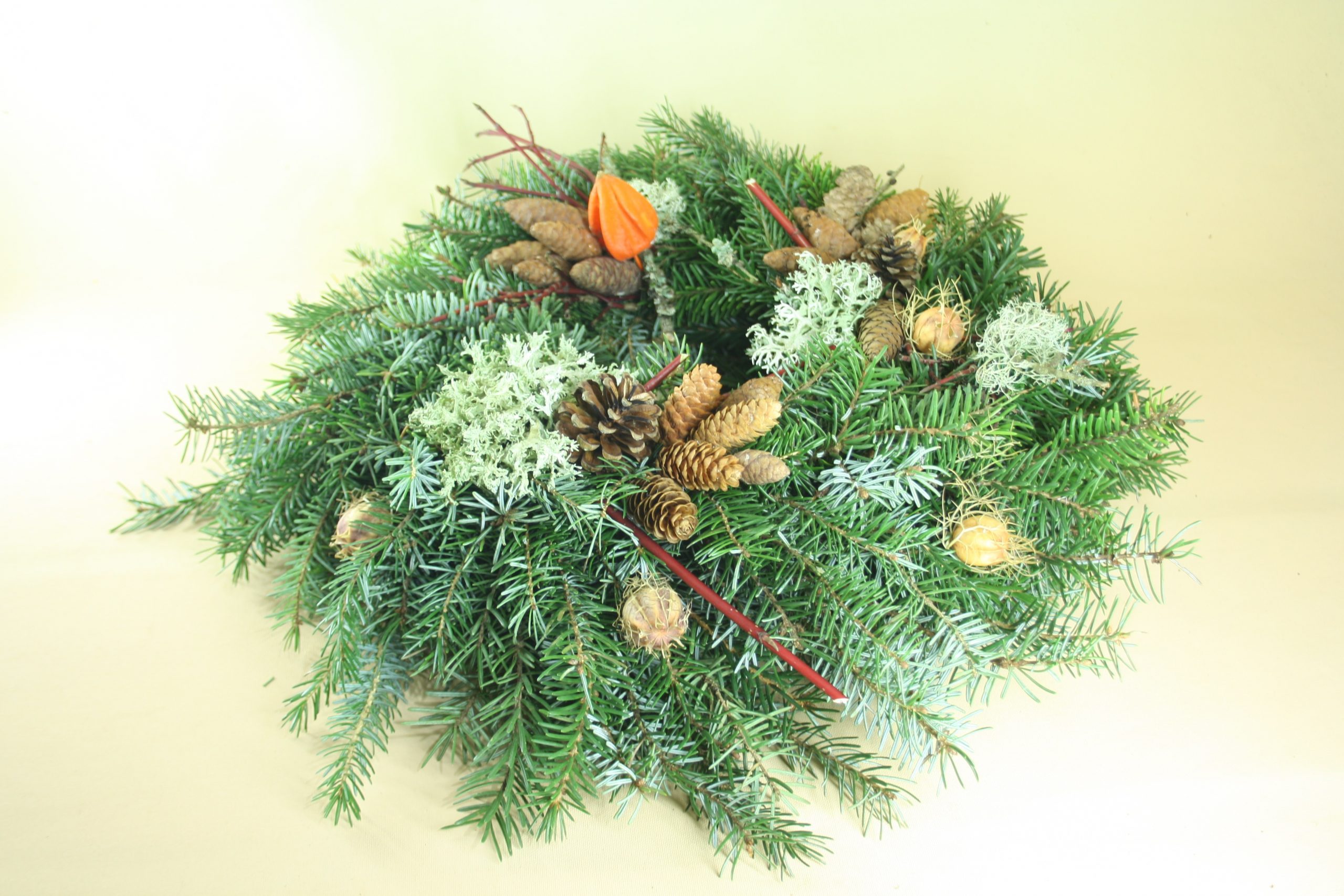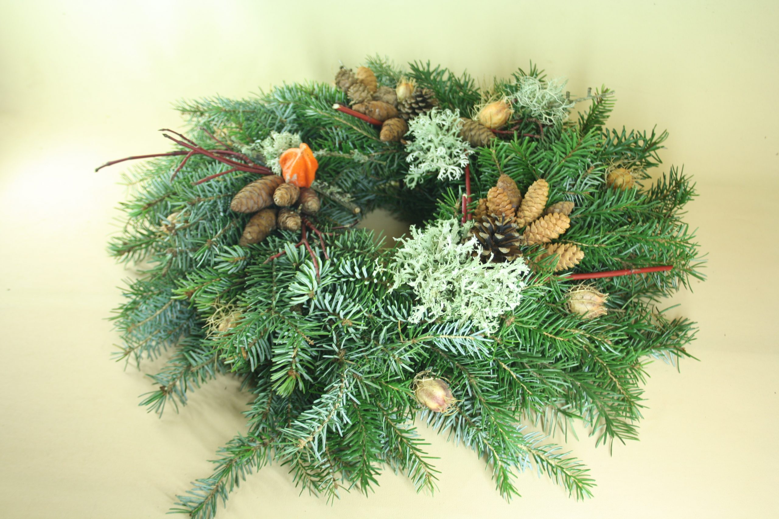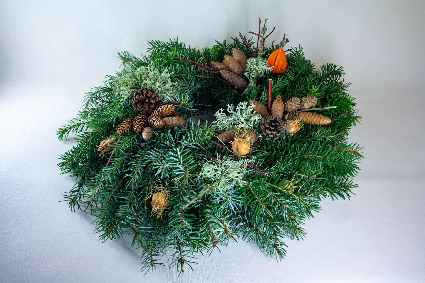 Serbijas egles vainags, diametrs 30 cm, izgatavots uz pašu izgatavotas salmu pamatnes. Dekorēts ar dabas materiāliem – melnās egles un Serbijas egles čiekuri, grimoņu zari, ķērpji, fizālis, nigella.