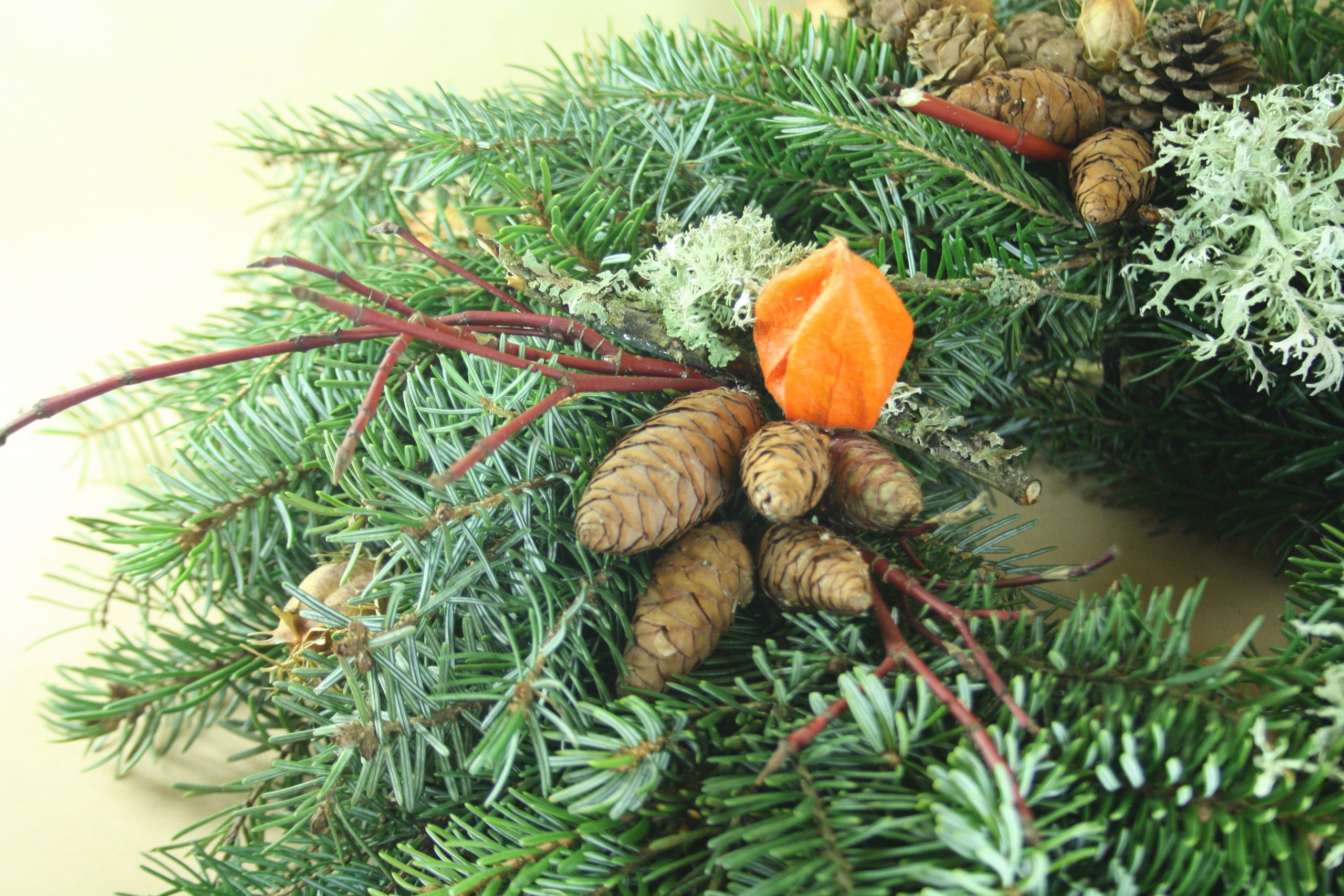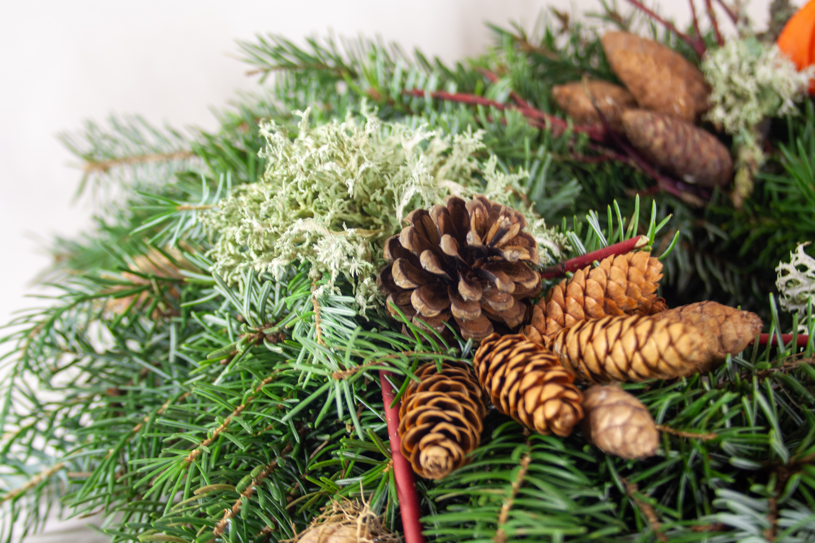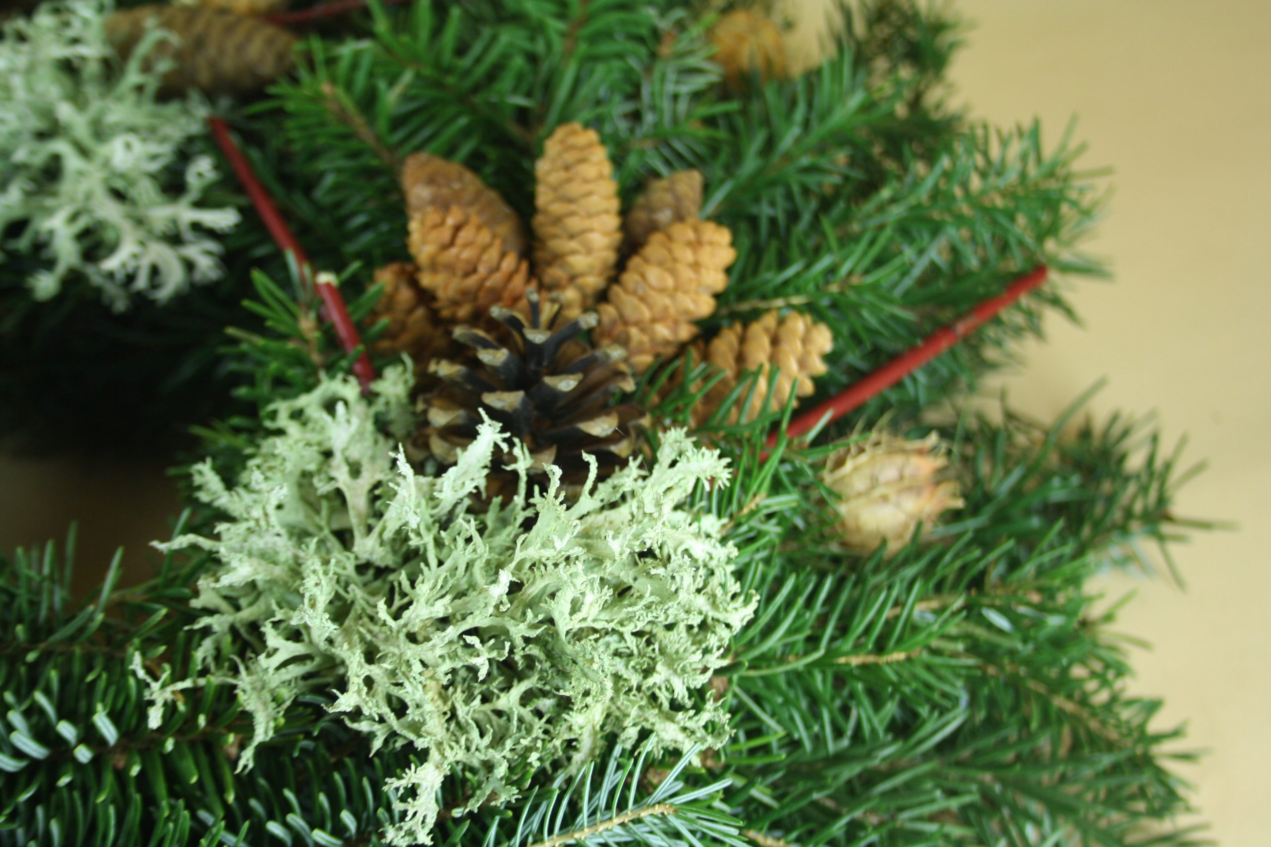 Serbijas egles vainags, diametrs 30 cm, izgatavots uz pašu izgatavotas salmu pamatnes. Dekorēts ar dabas materiāliem – melnās egles un Serbijas egles čiekuri, grimoņu zari, ķērpji, fizālis, nigella.