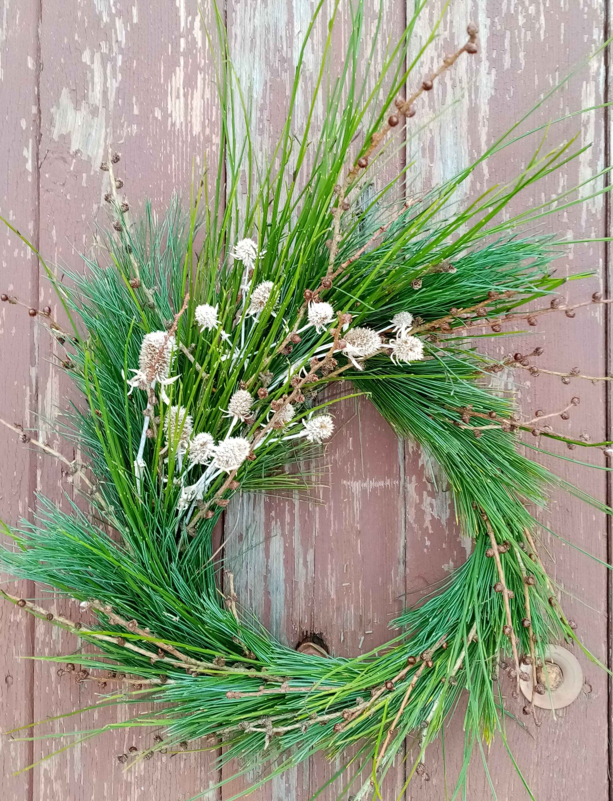 Asimetrisks dekors- vainags durvīm, izgatavots no dabīgiem materiāliem.
