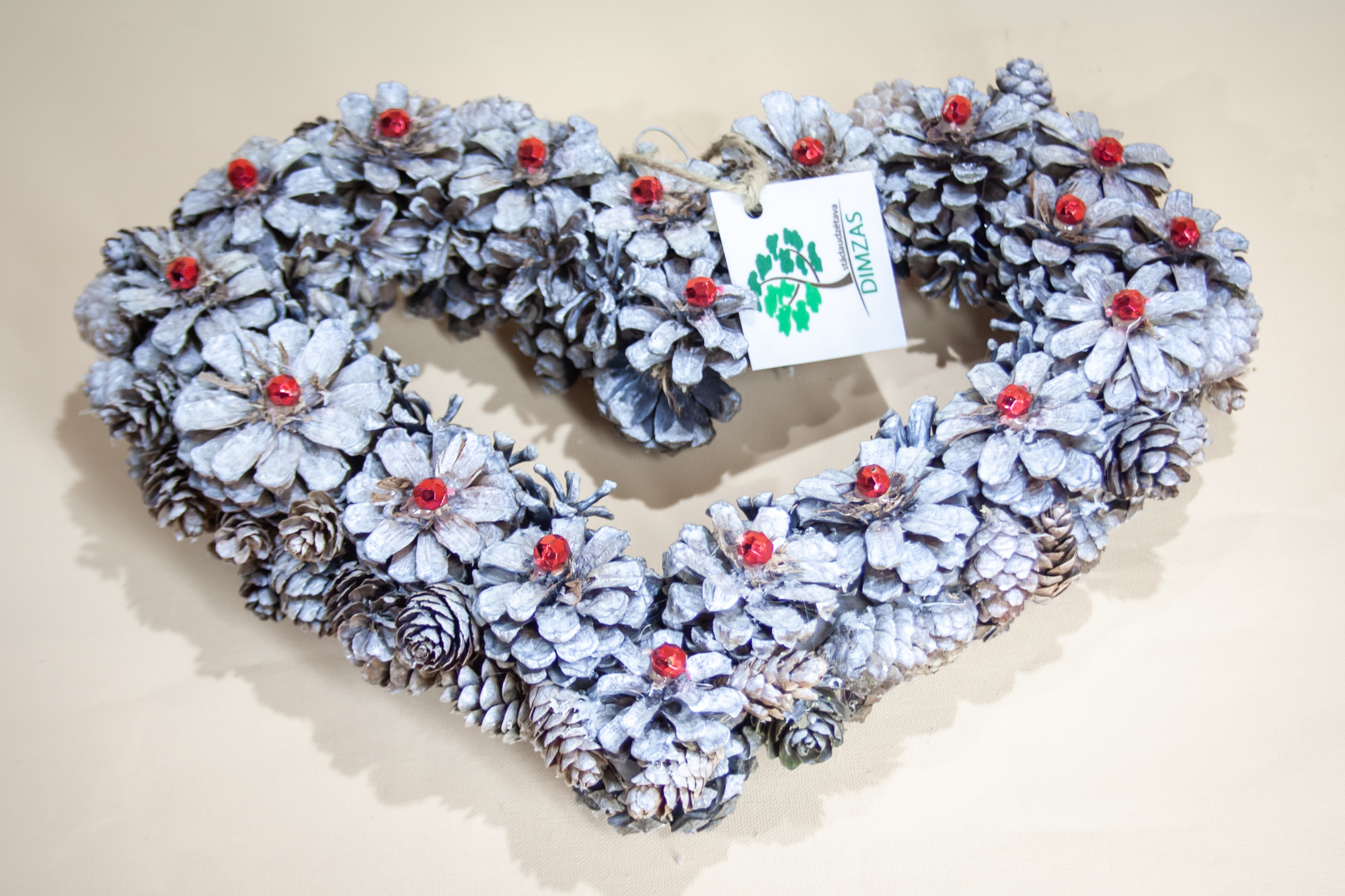 Izmantotie materiāli – baltā krāsā krāsoti kalnu priedes čiekuri un melnās egles vai Kanādas egles čiekuri, ievākti Latvijā, stādu audzētavā Dimzas, roku darbs.