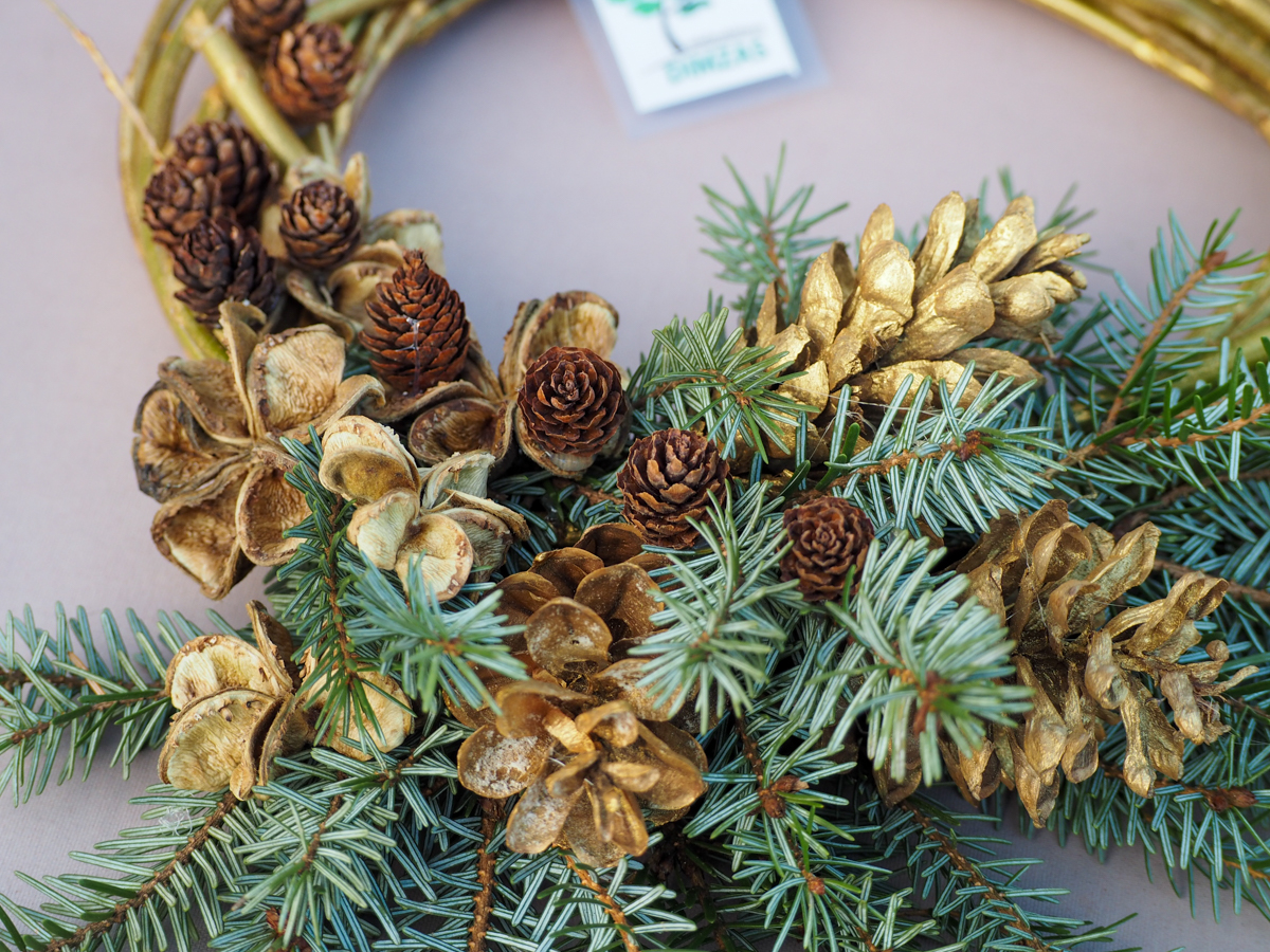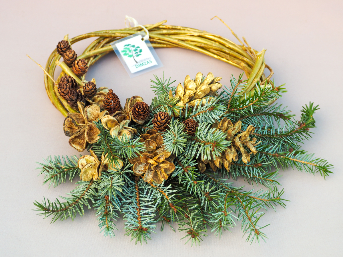 Durvju vainags uz klūgām, zelts, serbijas egle, čiekuri