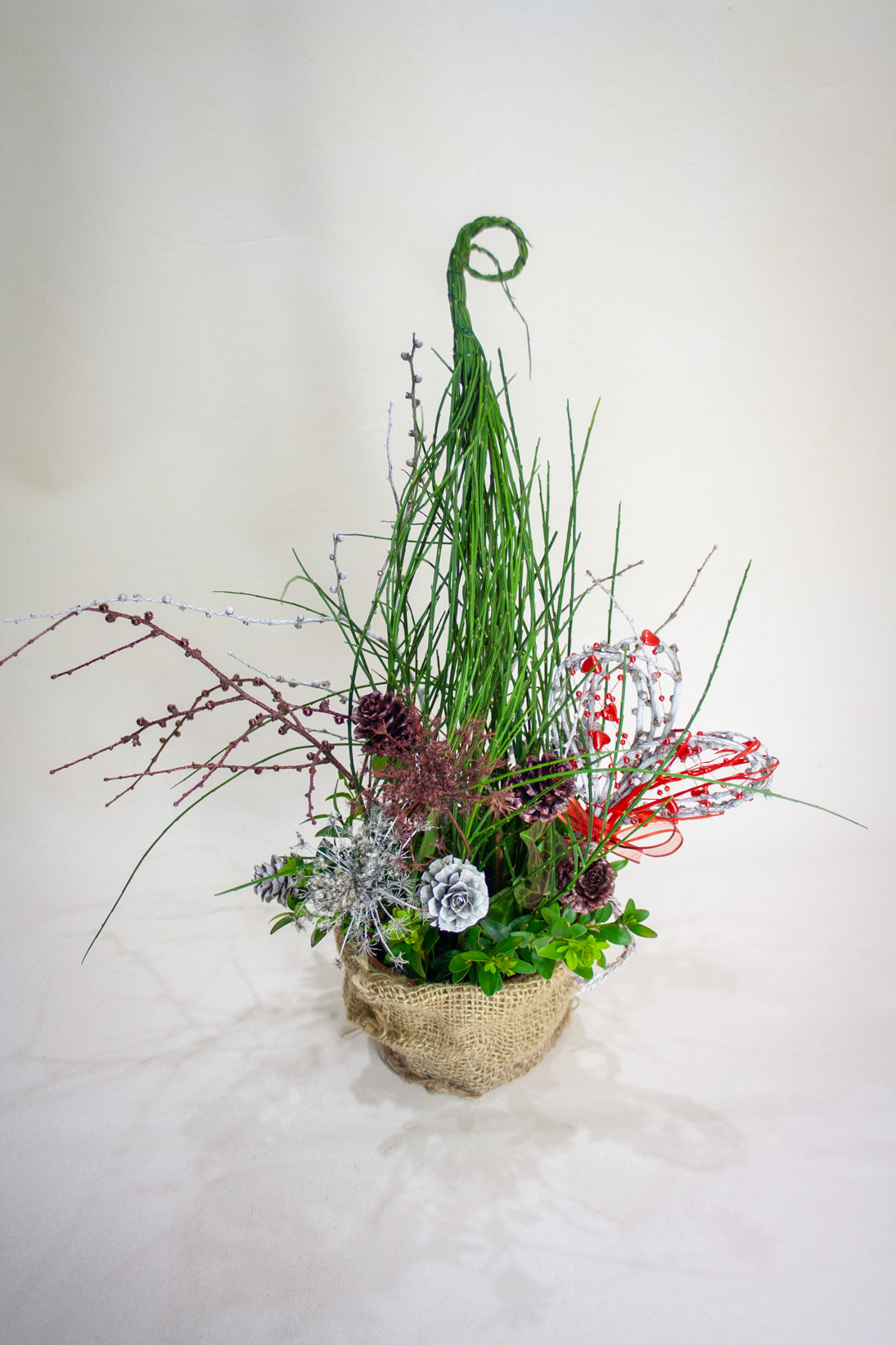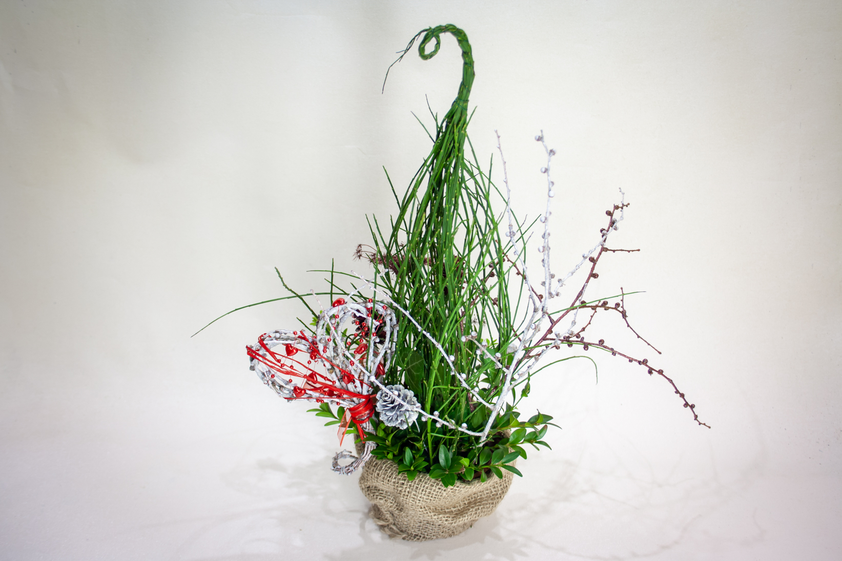 Kompozīcijas-dekora izgatavošanai izmantota dzīvo augu oāze, smalki parastā slotzara, bukša, lapegles zari; krāsoti hibrīdās lapegles čiekuri.