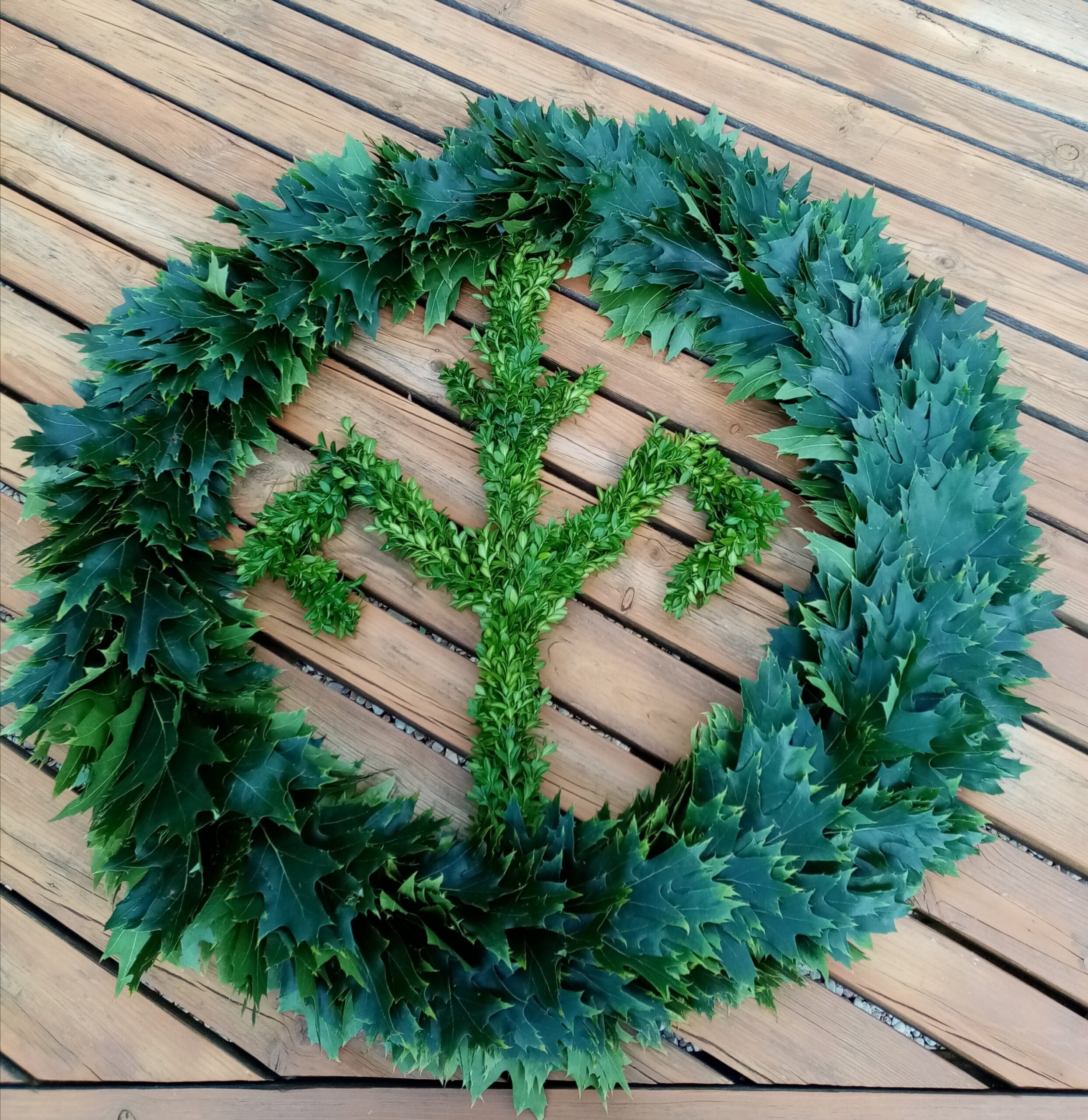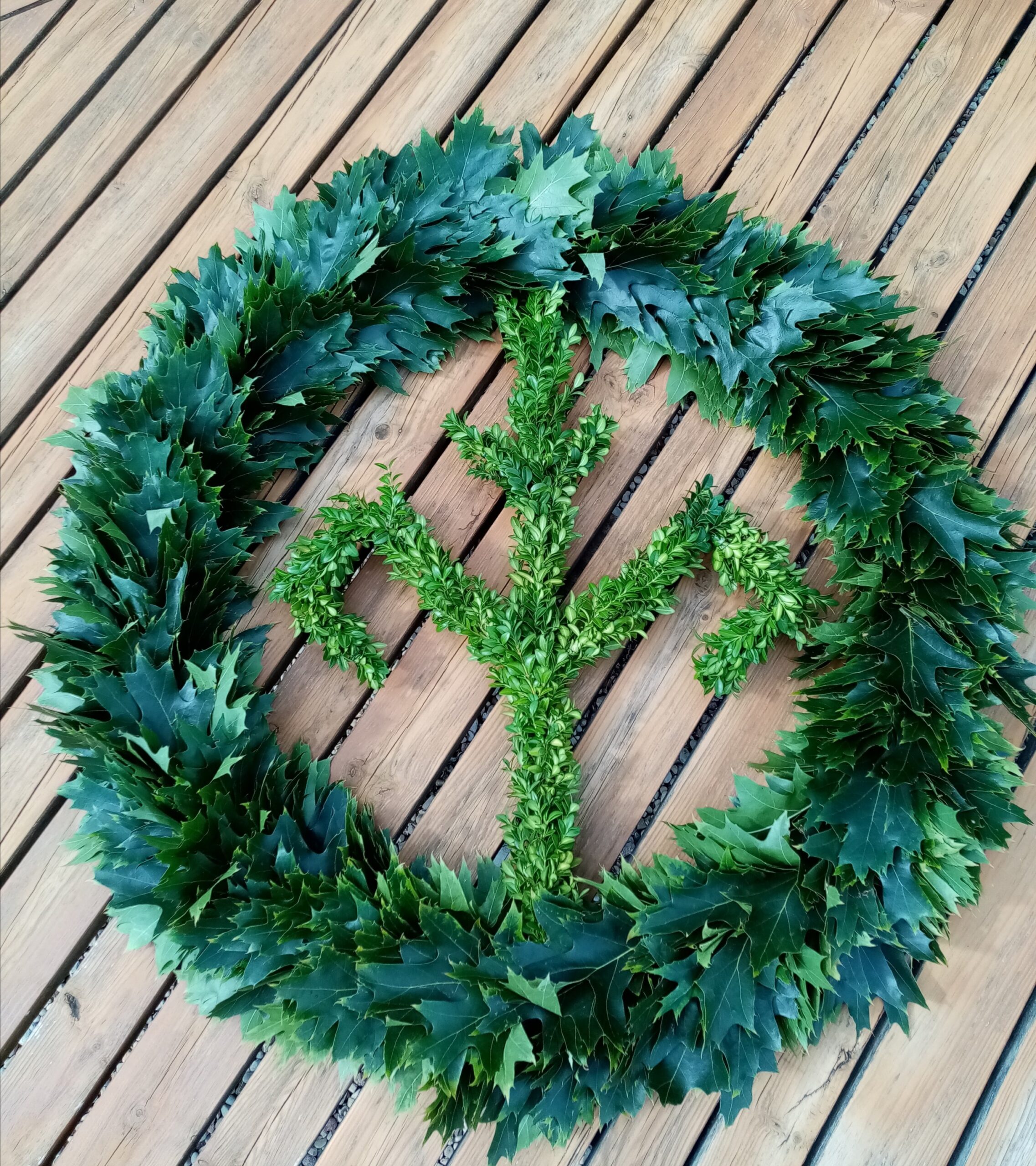 Vainagā iestrādāta Austras koka zīme – Latvju aizsargzīme – zīmes spēku izmanto, lai sargātu sevi, saimi un mājokli. Zīmes izgatavošanā izmantoti metināti vītņu stieņi, mūžzaļā bukša zari.