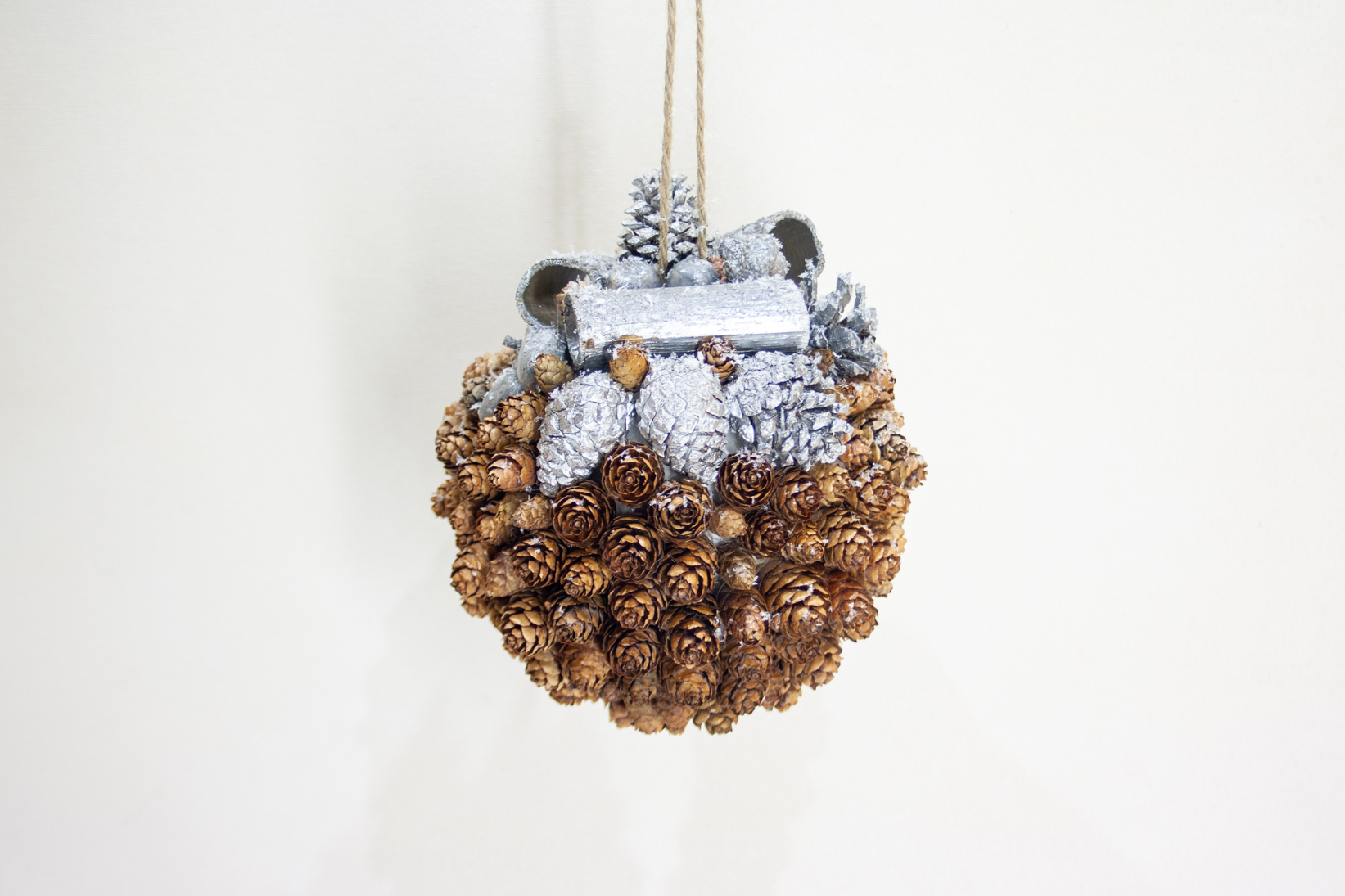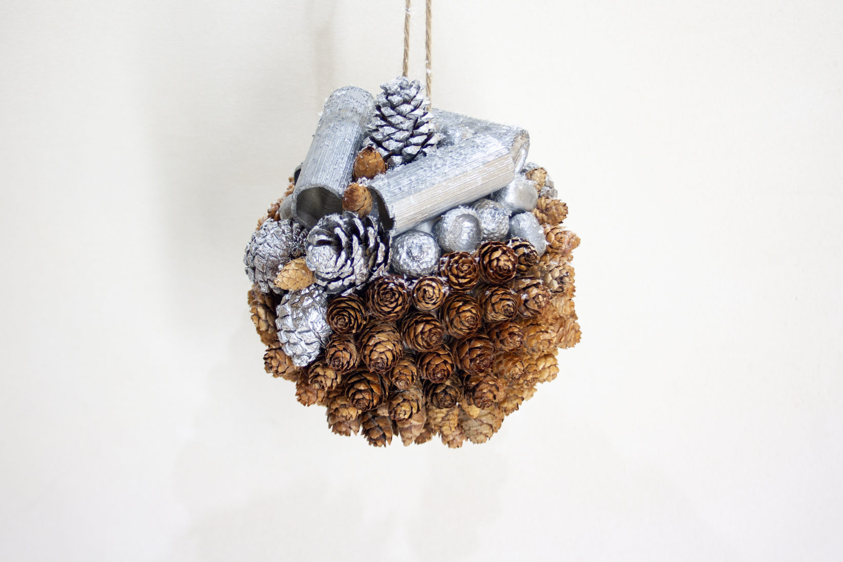 Piekarams Ziemassvētku dekors – bumba. Izgatavots no melnās egles čiekuriem, sarkanā ozola zīlēm, priedes čiekuriem, sūrenes stobriņiem sudraba krāsā. Izmantojams no visām pusēm kā karināms dekors. Diametrs 13 cm.
