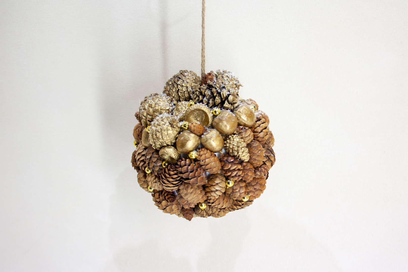 Zeltītā Ziemassvētku bumba, čiekuri un zīles – karināms dekors, D 13 cm