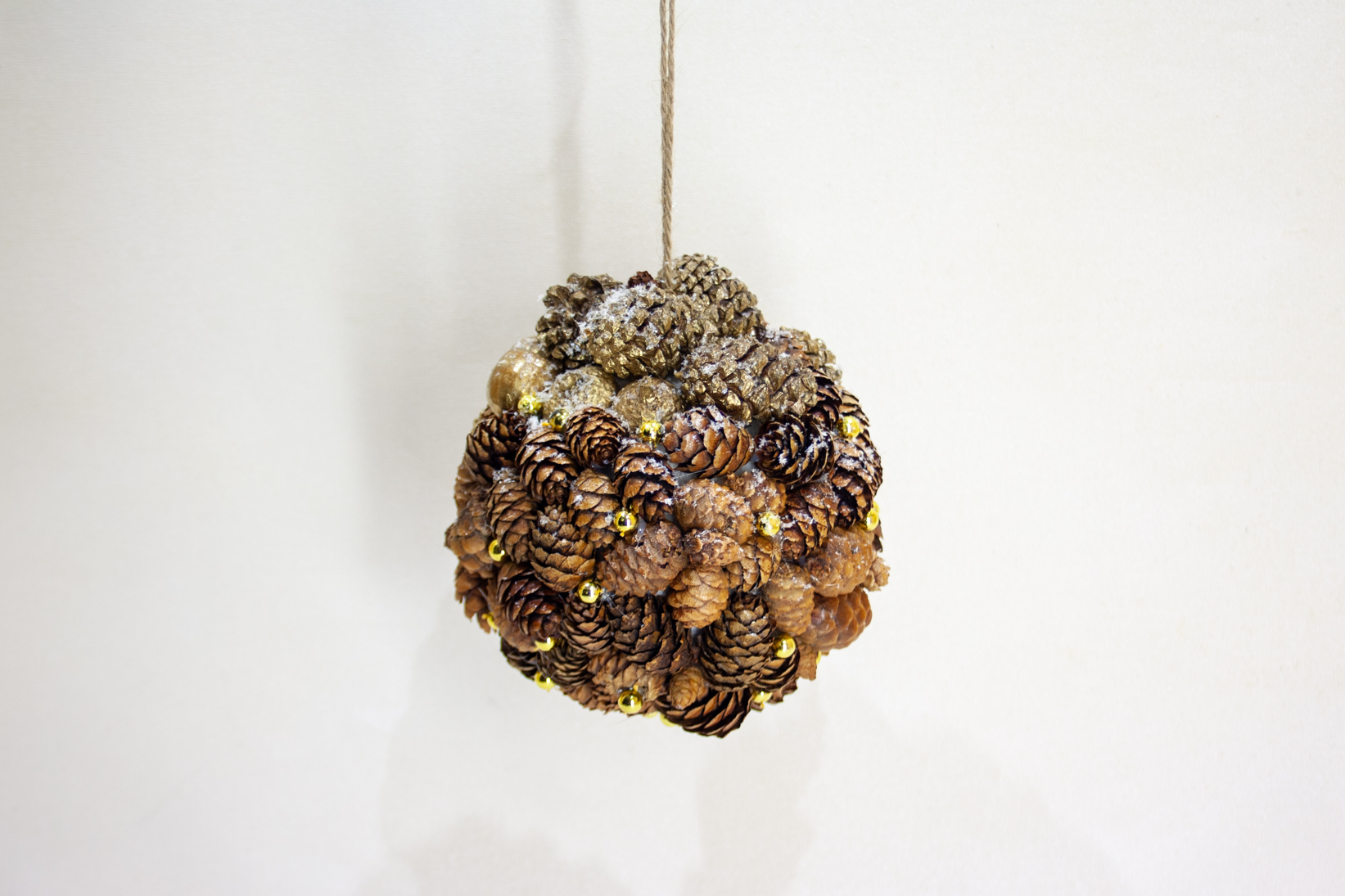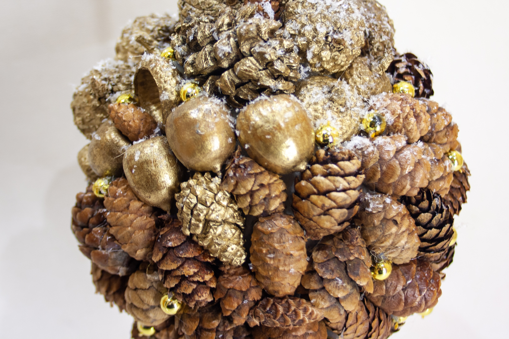Piekarams Ziemassvētku dekors – bumba. Izgatavots no melnās egles čiekuriem, sarkanā ozola zīlēm, priedes čiekuriem un zelta pērlītēm. Izmantojams no visām pusēm kā karināms dekors. Diametrs 13 cm.