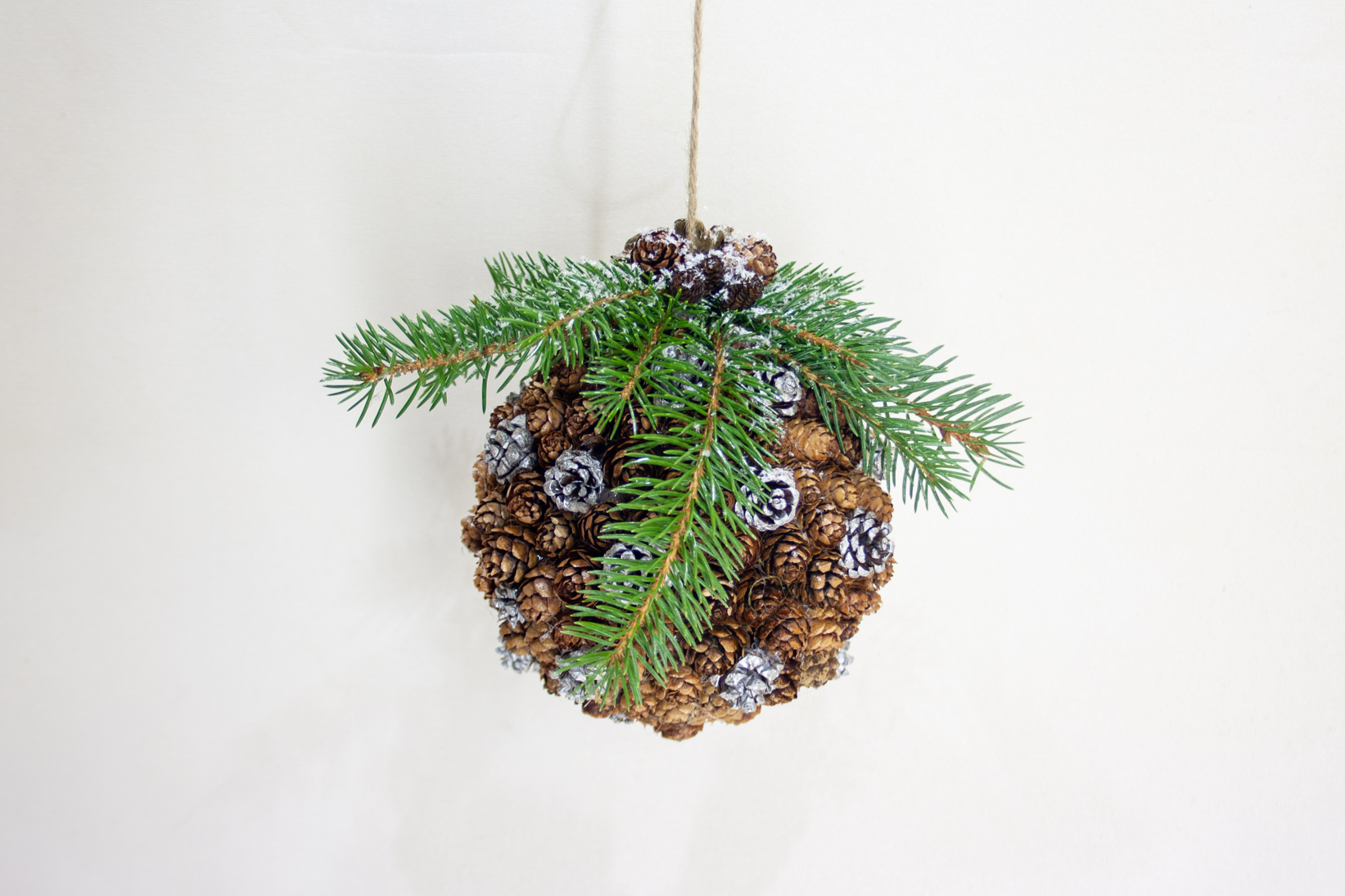 Piekarams Ziemassvētku dekors – bumba. Izgatavots no melnās egles, priedes un alkšņa čiekuriem un asās egles (sudrabegles) zariem. Izmantojams no visām pusēm kā karināms dekors. Diametrs 13 cm.
